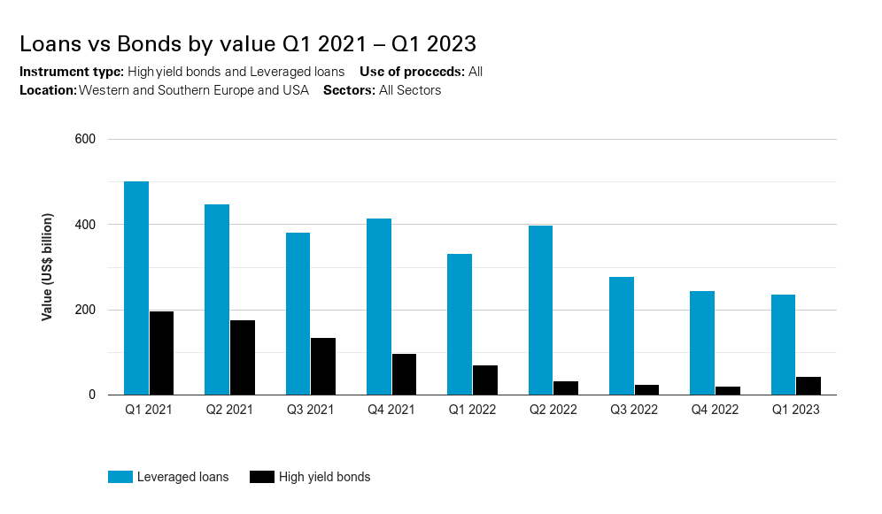 Two products are used primarily in the debt portion of LBOs: bonds and loans. Bonds, in particular, are a disfavoured means of financing currently. High-interest rates drive the price of bonds on the secondary market down. Consequently, their coupon (interest) rates increase relative to their trading price, increasing their yield. When bonds already trading have high yields (and so offer high returns to investors), it becomes harder for new bond issuances to attract investors with lower coupon rates. Issuers would need to match market yields, which are high and costly.