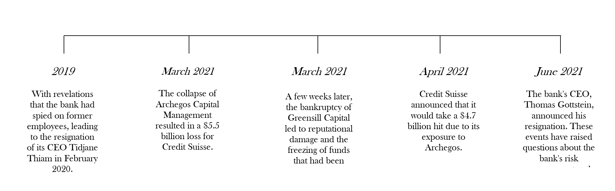 With a presence in over 50 countries and a workforce of approximately 50,000 employees, the bank has built a reputation for providing exceptional financial solutions to its clients. Credit Suisse offers a range of services including investment banking, private banking, asset management, and retail banking, catering to clients worldwide. Despite its impressive track record, Credit Suisse has faced significant challenges in recent years, including a series of scandals that have impacted its reputation and financial performance. This is the timeline of the events: